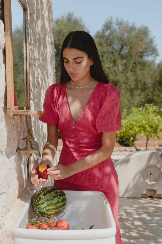 Amora Short Sleeve Bias Midi Dress - Raspberry Ditsy Gingham