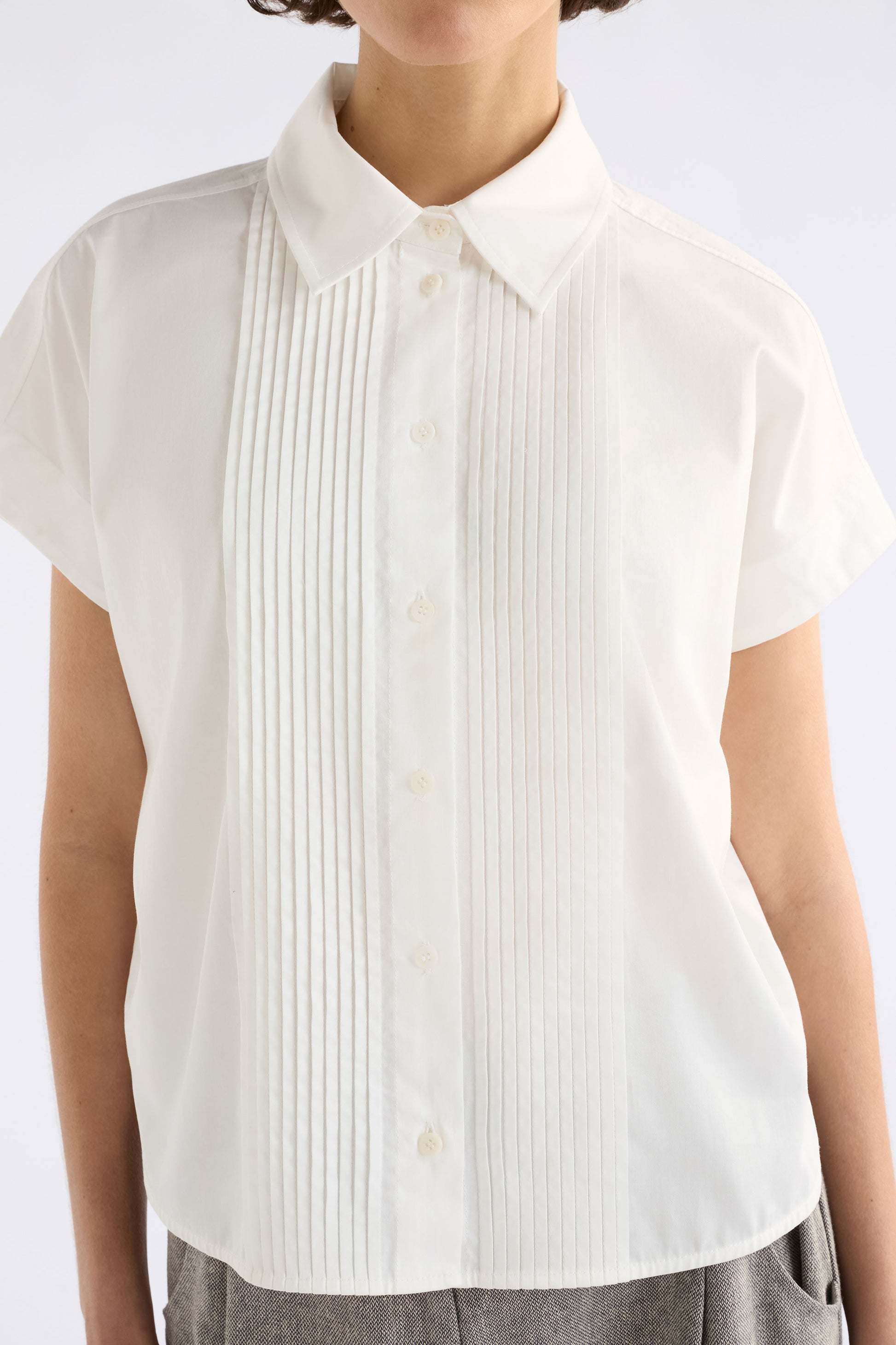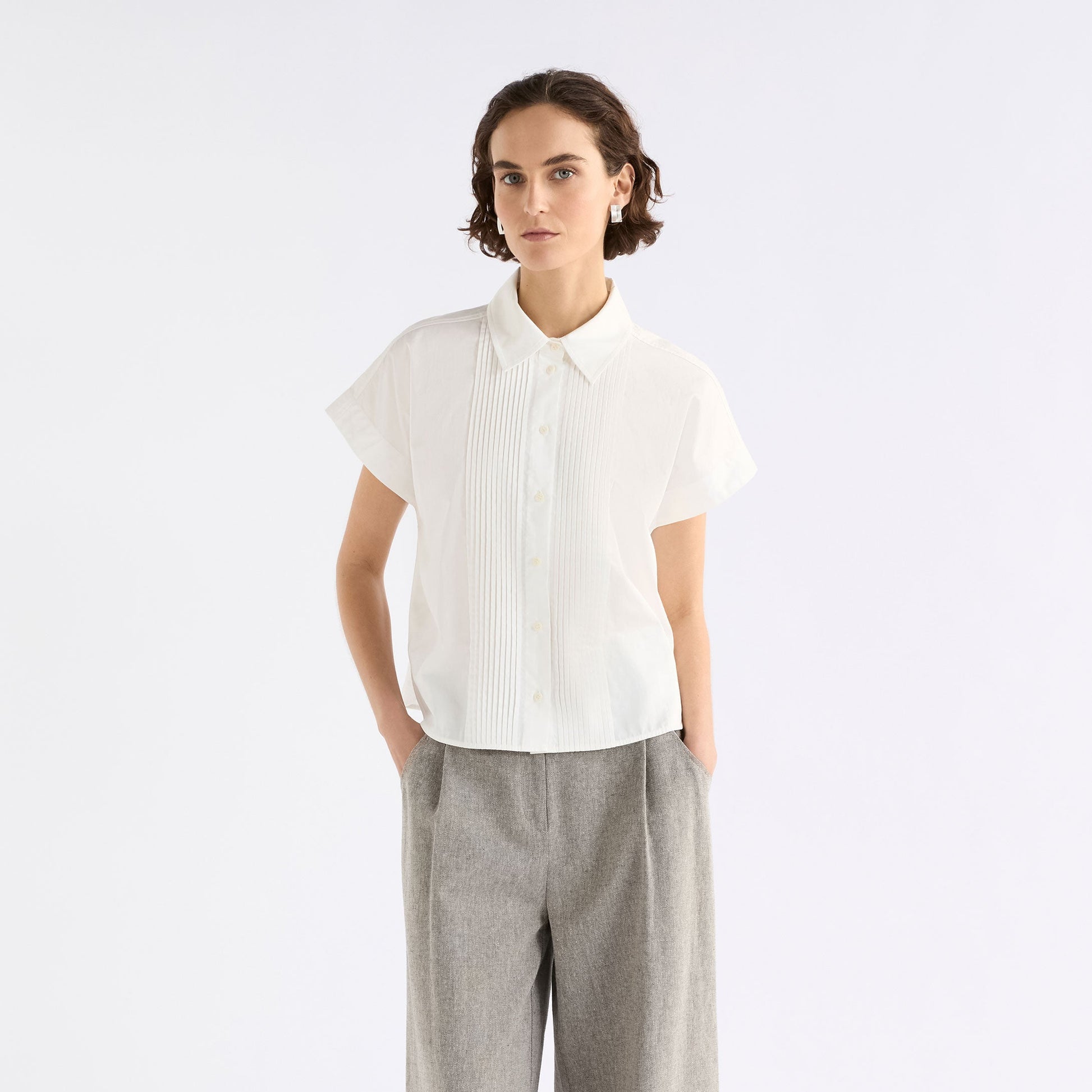 The Apres Shirt showcases relaxed tailoring in 100% organic cotton. This slightly cropped, capped sleeve shirt features intricate front pleats, adding interest, texture and definition. The short, capped sleeves give this style a sleek feminine silhouette. Pair this button up short sleeve shirt with tailored pants, shorts or skirts.