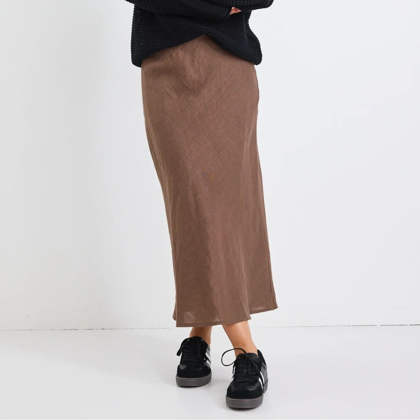 Meet your new trans-seasonal essential. The chocolate brown midi skirt is crafted from 100% natural linen, giving it a breezy, breathable feel with a soft touch against the skin. With its flattering pull-on design and gentle elastic waist, it's as effortless as it is elegant—perfect for styling with anything from crisp shirting to casual tanks. Fully lined for added comfort, it’s a timeless staple you'll reach for again and again.
