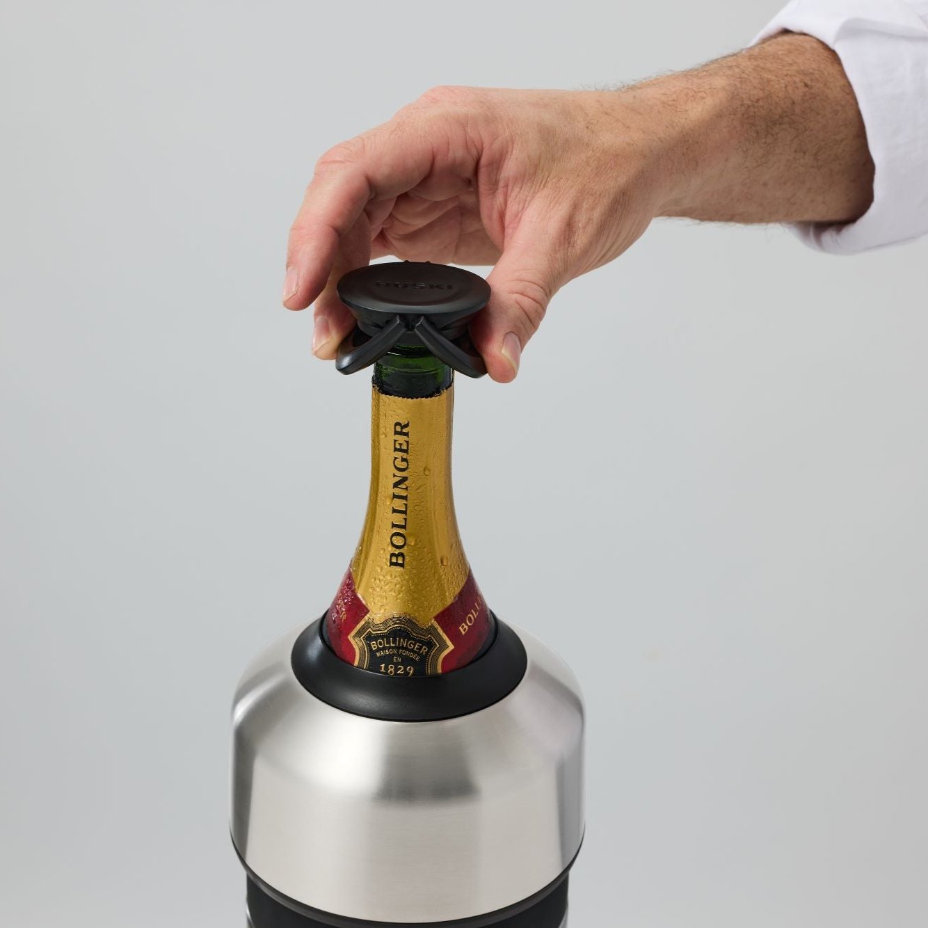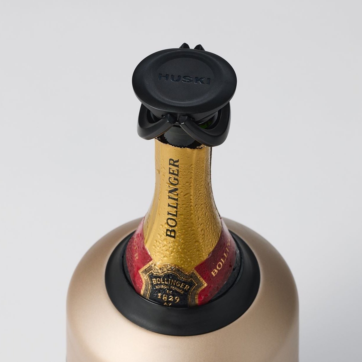 The detachable bottle stopper also fits securely in the base of your Huski Champagne Cooler.