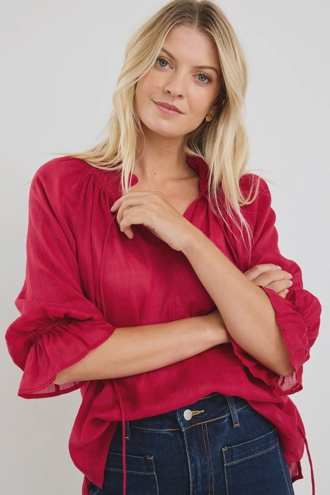 - Soft puff sleeves with subtle shirring