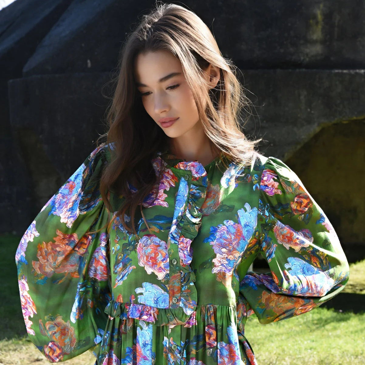 Bursting with colour and personality, the ‘Floral Flair’ dress, brings an artistic flair to every movement. Crafted using the vibrant ‘Brush Strokes’ printed fabrication to create a dreamy, painted on effect, this dress features a gathered waist for an effortlessly flattering shape, frill placket and frill cuffs that add a soft playful touch, with the button through front keeping it versatile. Feminine and full of charm, this is the dress that turns the simplest outings into a masterpiece.