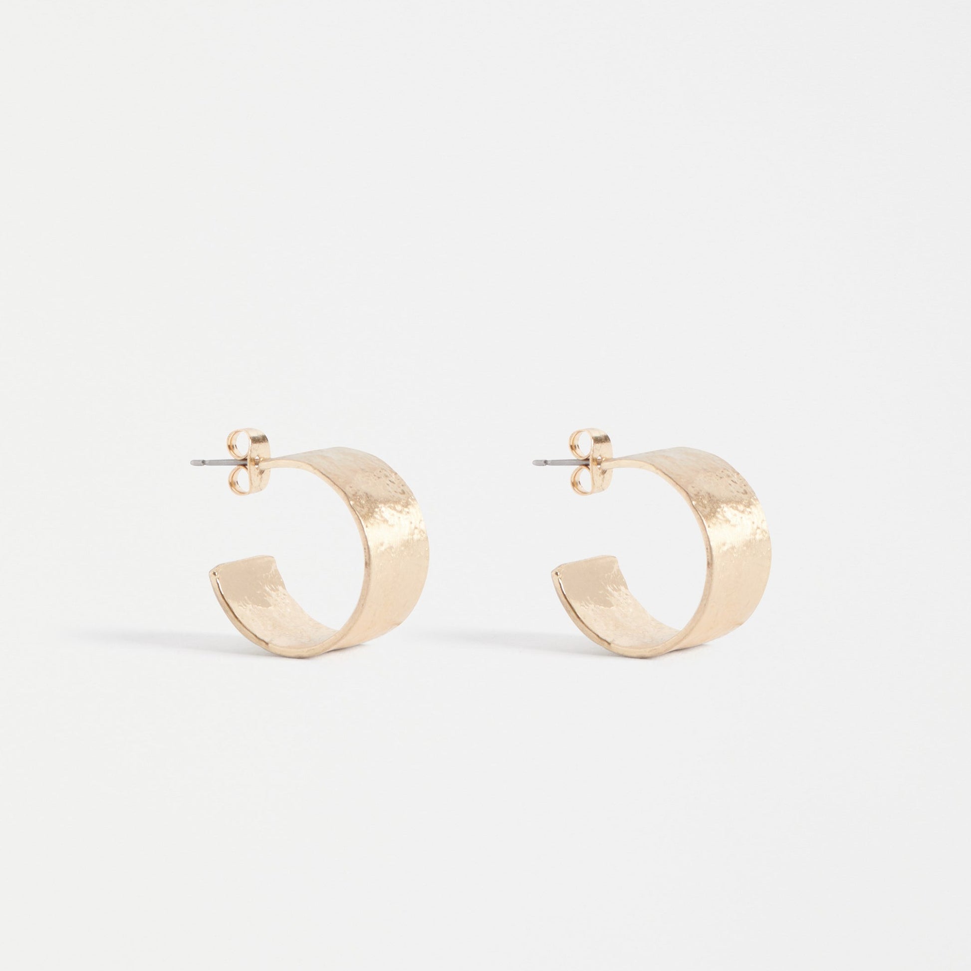 The Gild Hoop Earring is a classic style featuring a hammered texture and a brushed metal finish. This style can be paired with the Gild Cuff Bangle for a versatile look.