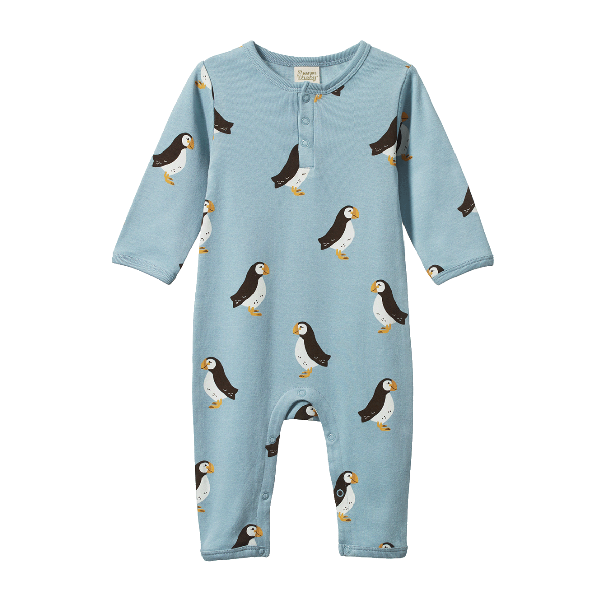A one piece pyjama suit, especially good for keeping baby's lower back covered and warm. Features convenient snap domes part the way down from the neck and around the legs to facilitate easy nappy changes. Loose fitting and roomy for a comfy night’s sleep. Made from 100% organic cotton, soft and breathable. To minimise shrinkage, this fabric has been pre-washed.