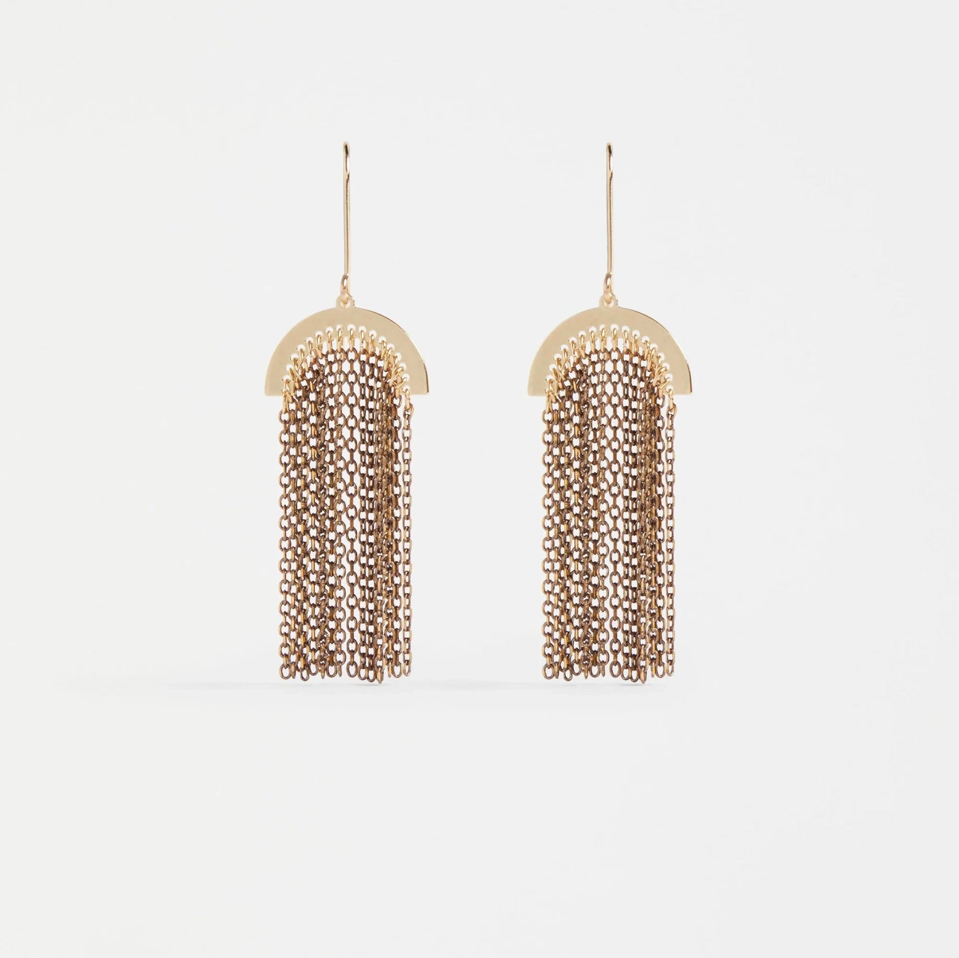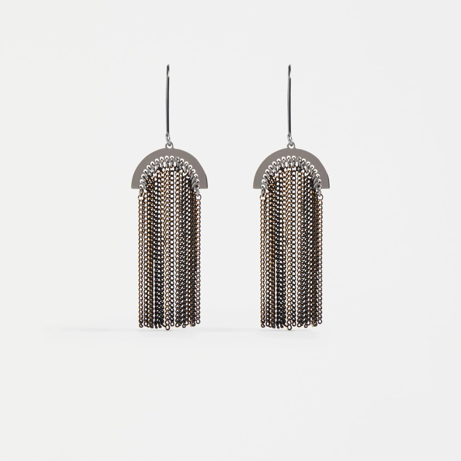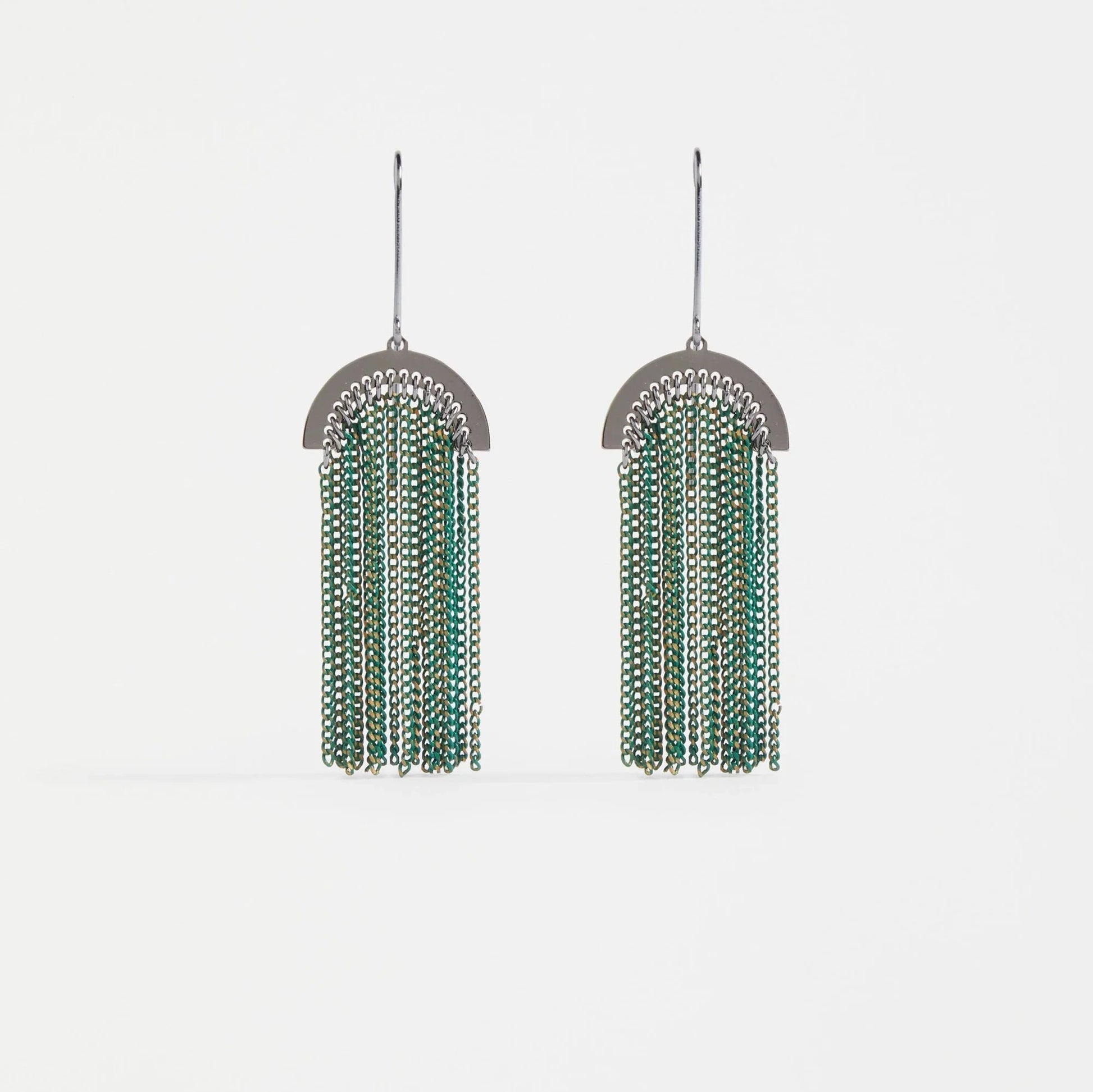 The Kade Hook Earring is all about movement. Columns of fine chain fringe dangle from a half-moon-shaped metal base, connected by jump rings. With every step, the Kade Hook Earring sways and catches the light. Each metal chain is coated in a sophisticated colour that complements the metal base. Affixed to an easy to slide on shepards hook. Offered in Black, Bronze or seasonal Forest Green.