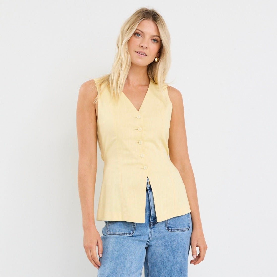 Fresh, flattering, and full of charm — the Latitude lemon vest is your sunshine-ready wardrobe hero. Made from a premium blend of linen and viscose with a soft lining, this sleeveless design feels breathable yet polished. The angled button front and tailored fit create a sleek silhouette that easily shifts from casual to refined.