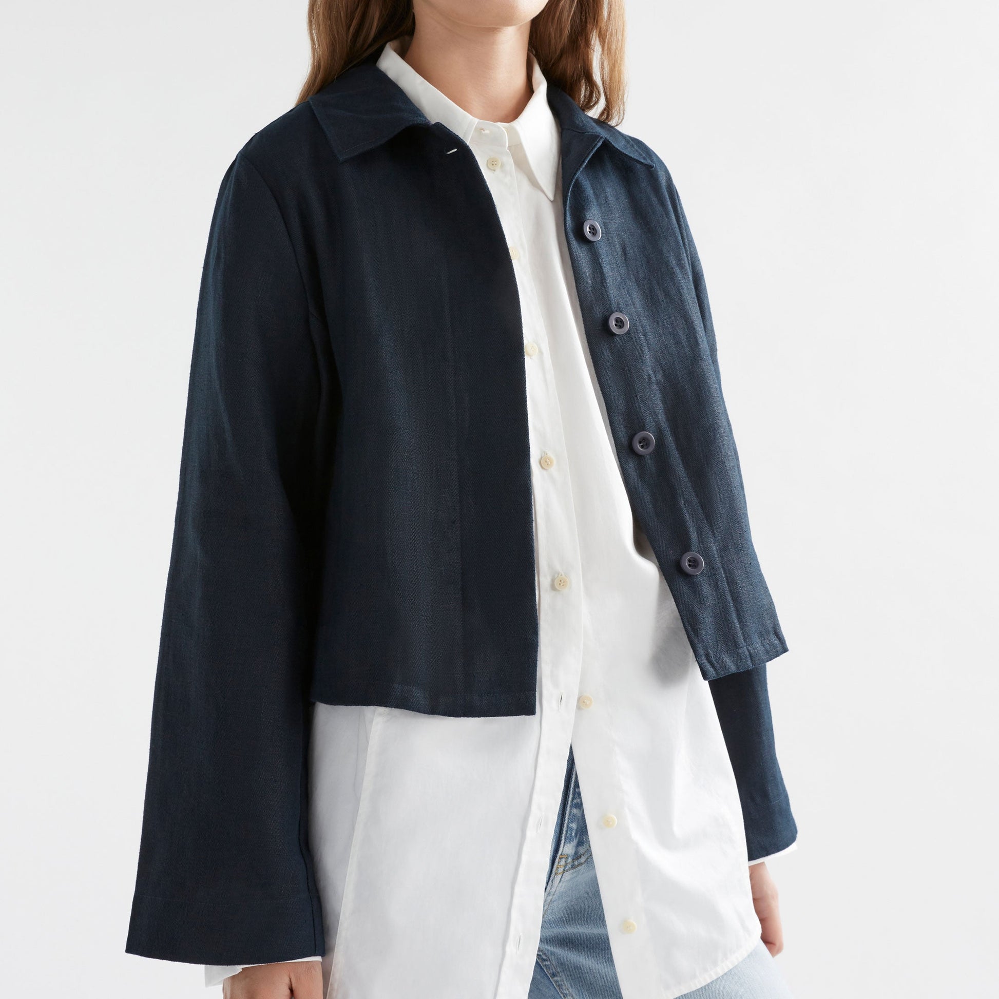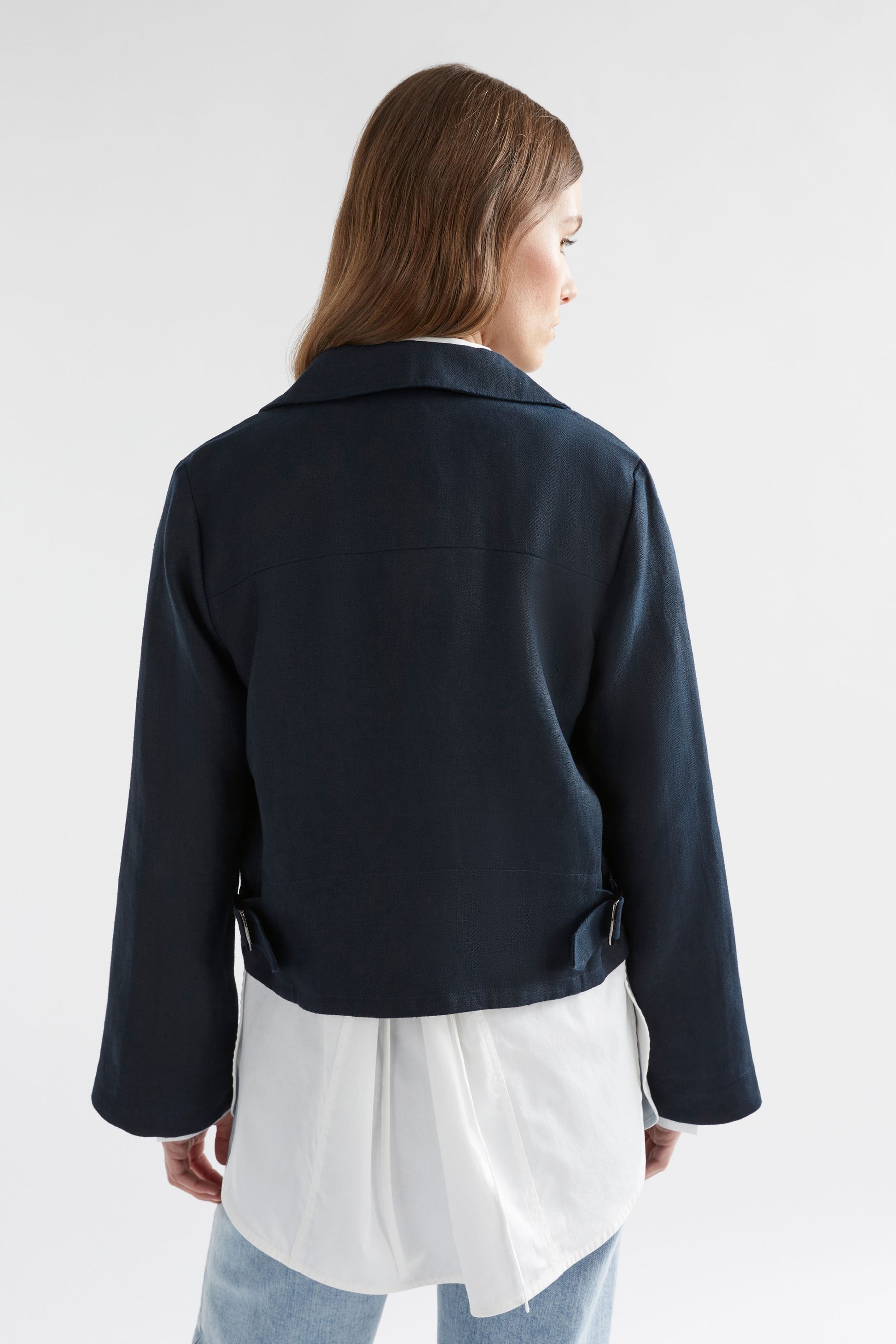 n a deep ink colour and comfortable, 100% hemp herringbone weave, this utility jacket is your wear-everywhere companion. With its structured collar and sharp, clean fit, it’s ideal for layering over casual airport outfits or more polished destination looks. Adjust the fit with slider buckles at the side-seams. Offered in a deep Ink tone - selected for its styling versatility.