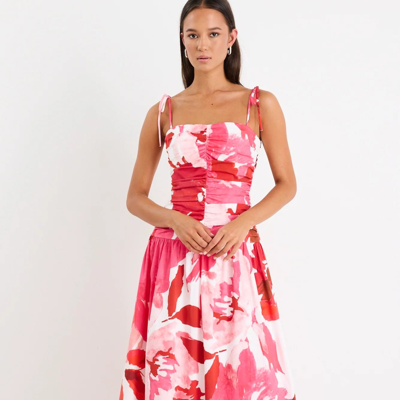 The Royalty Dress by Among the Brave is your go-to for making a vibrant entrance with zero effort. Featuring soft stretch cotton and a flattering ruched bodice, it flows into a beautifully pleated maxi skirt that moves with you. The bold floral print and sweet tie-up straps add the perfect feminine touch. It’s a dreamy piece for high-to-low dressing, style it up with statement heels or dress it down with casual flats.