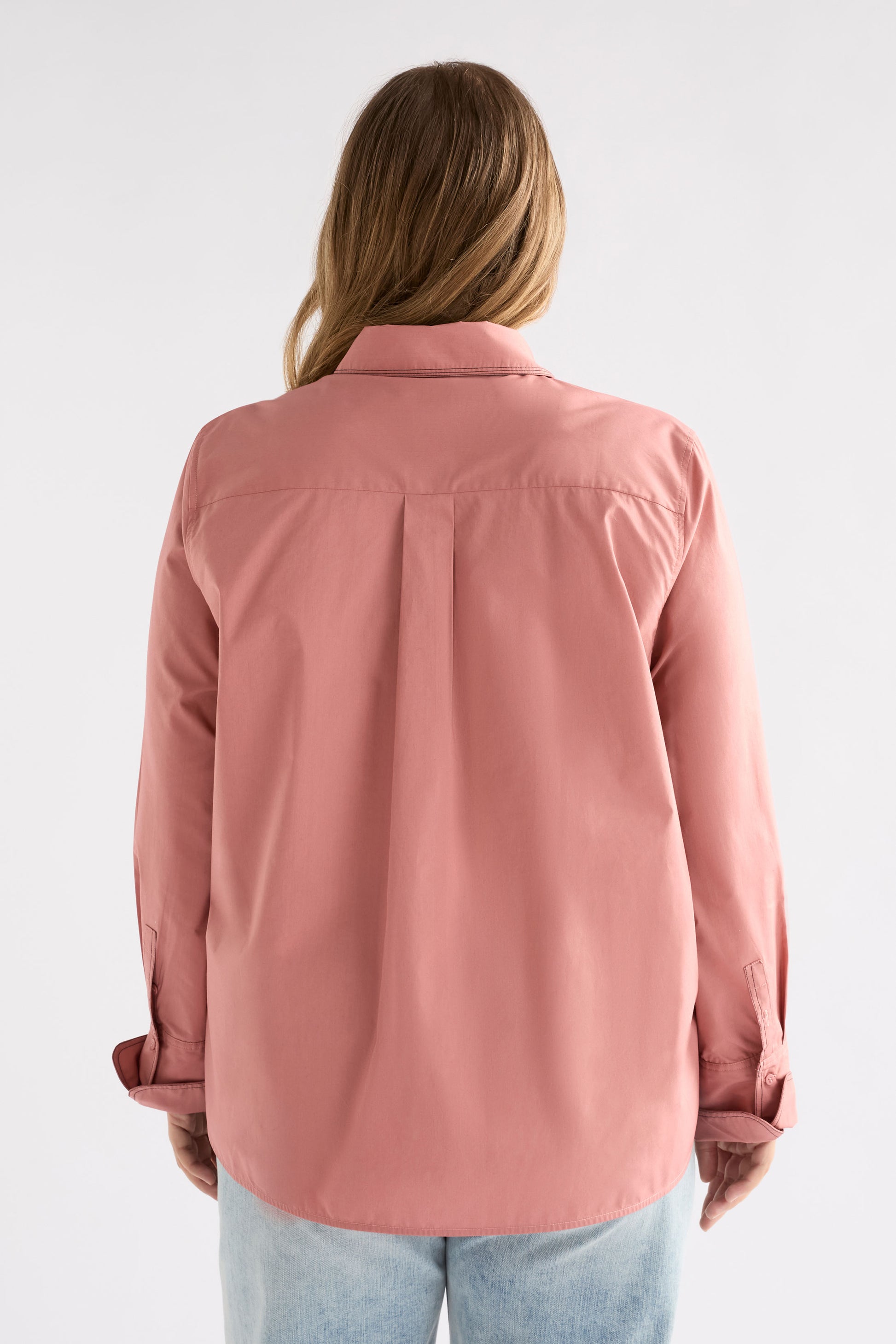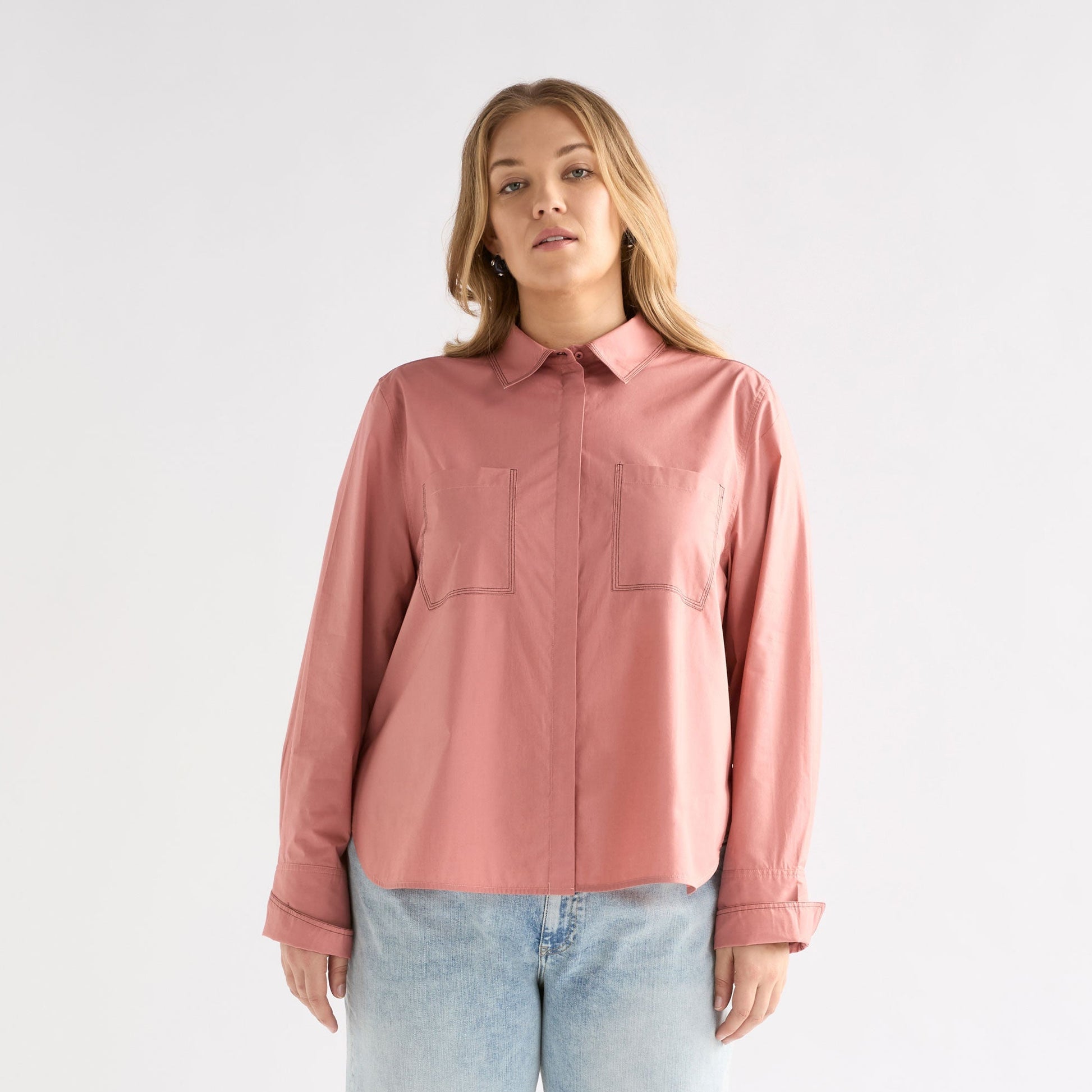 The Salli Shirt features classic collar with contrast top stitching creating a modern twist on shirt detailing. Made from GOTS certified organic cotton poplin with a soft, smooth surface and gentle drape. A relaxed fit with slightly dropped shoulders and concealed button-through placket. Finished with patch pockets at the chest and high-low hemline with curved side splits. Full-length sleeves with elongated buttoned cuffs complete this refined shirt